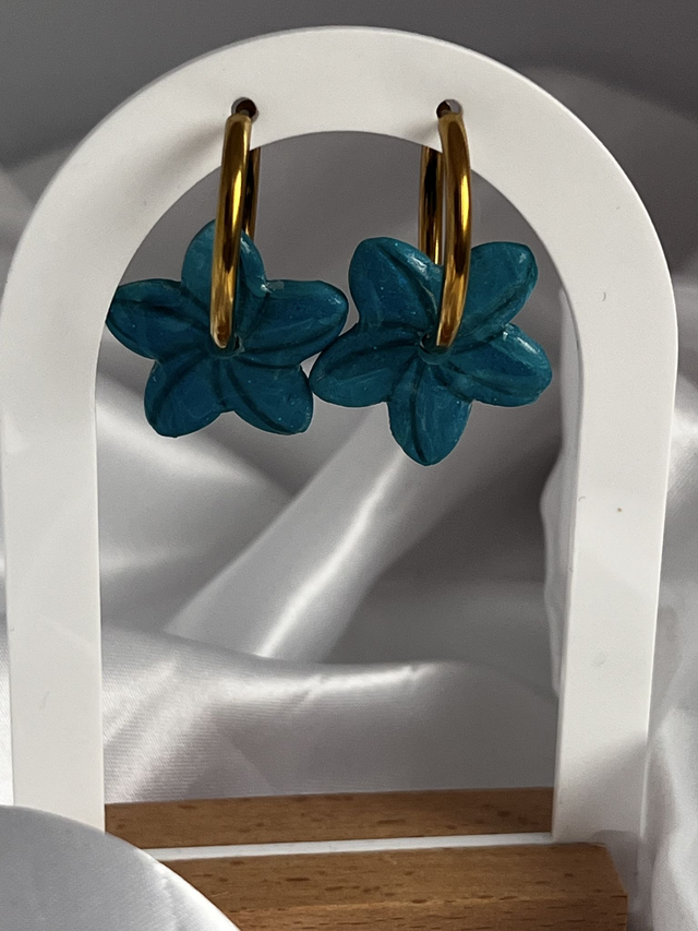 Boucles créoles 22 mm en acier inoxydable avec ses pampilles fleurs en argile polymère bleu et finition résine.