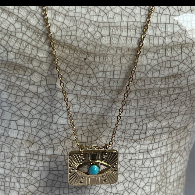 Collier en acier inoxydable et sa breloque rectangulaire œil de protection turquoise.