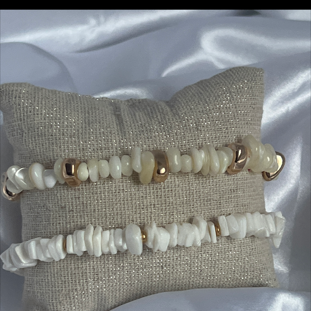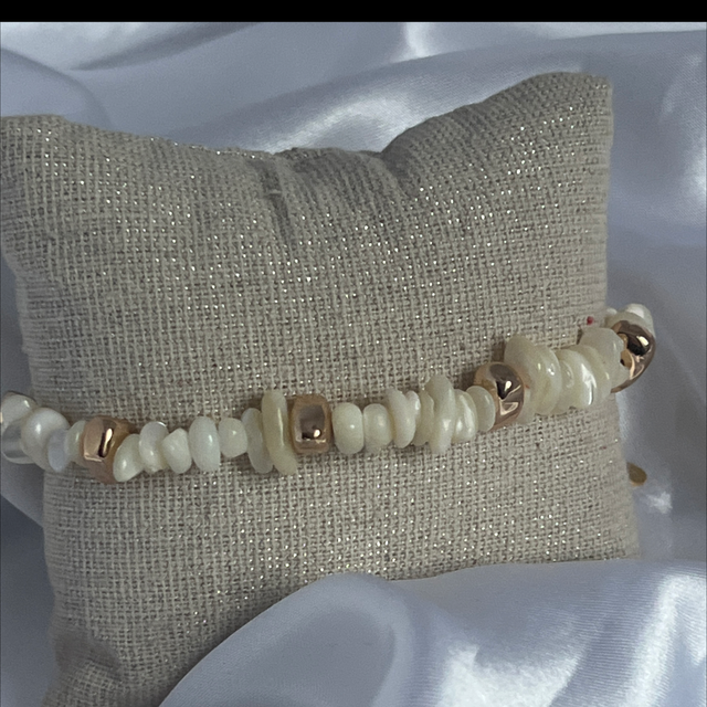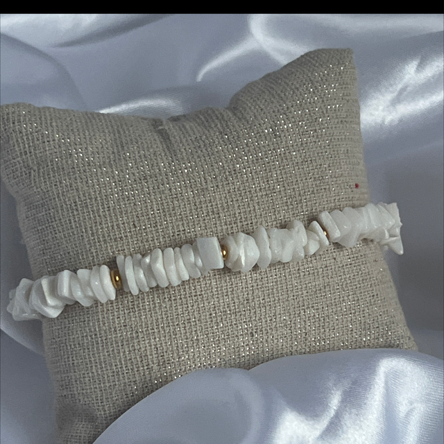 Bracelet perles chips blanches et hématites dorées et chaîne d'extension