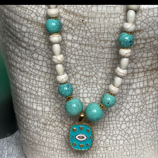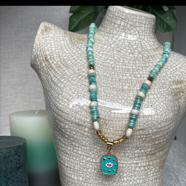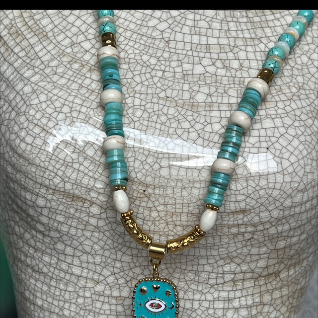 Collier de perles heishi coquillage beige/bleu/vert/ turquoise et son pendentif œil de protection en acier inoxydable. Deux versions possible à choisir par ordre de photo