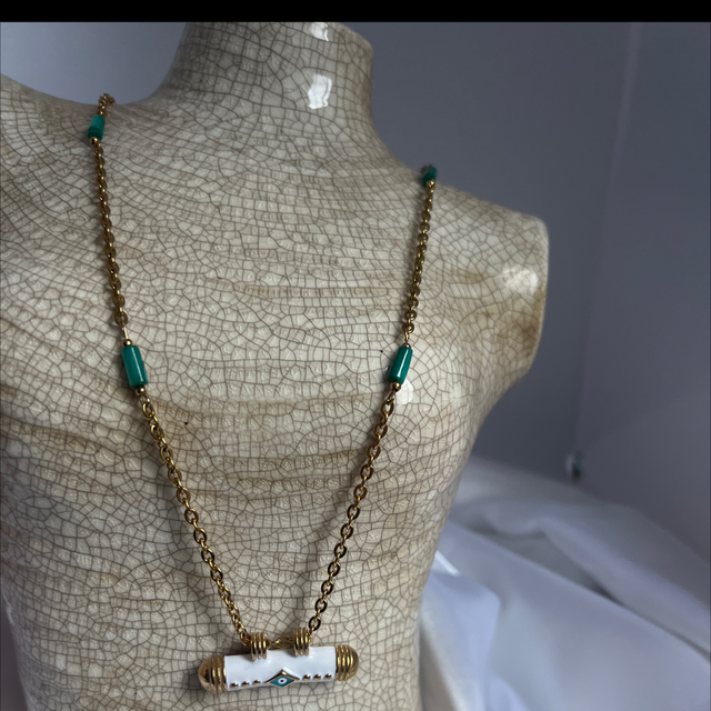 Collier en acier inoxydable et perle tube en soie verte et sa breloque ovale œil de protection blanc.