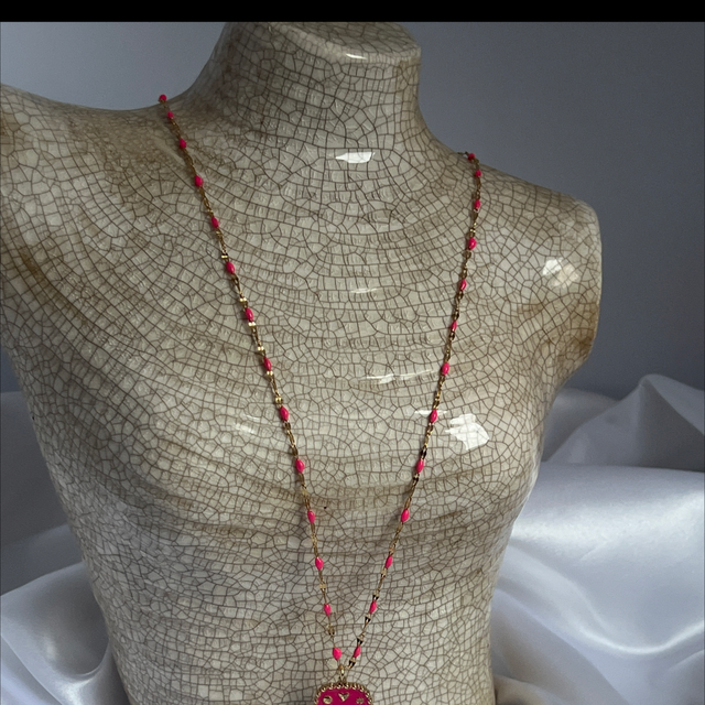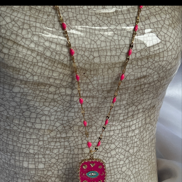 Collier chaîne perlée rose en acier inoxydable et sa breloque rectangle œil protection rose.